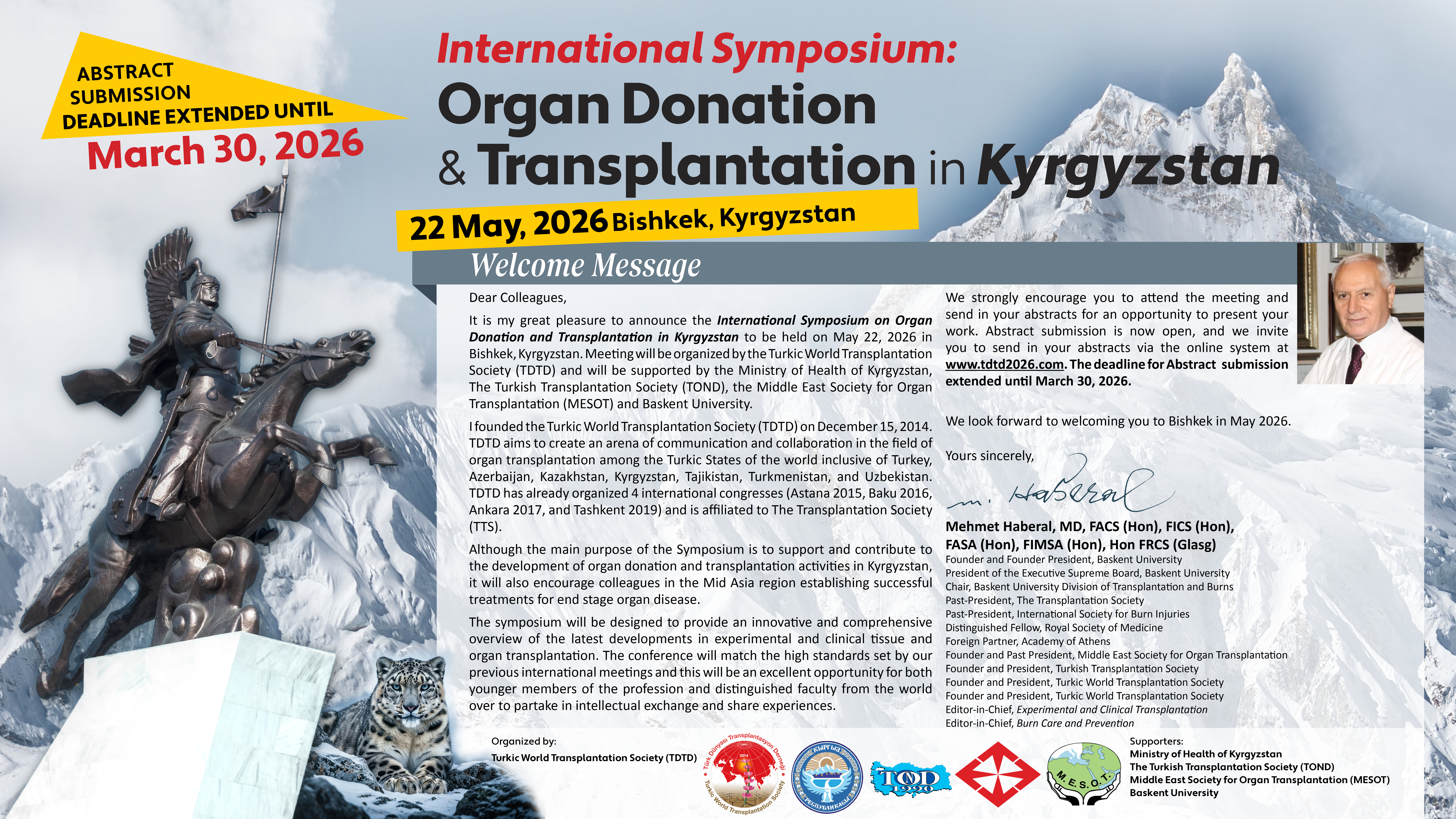 It is my great pleasure to announce the International Symposium on Organ Donation and Transplantation in Kyrgyzstan to be held on May 22, 2026 in Bishkek, Kyrgyzstan. Meeting will be organized by the Turkic World Transplantation Society (TDTD) and will be supported by the Ministry of Health of Kyrgyzstan, The Turkish Transplantation Society (TOND), the Middle East Society for Organ Transplantation (MESOT) and Baskent University.